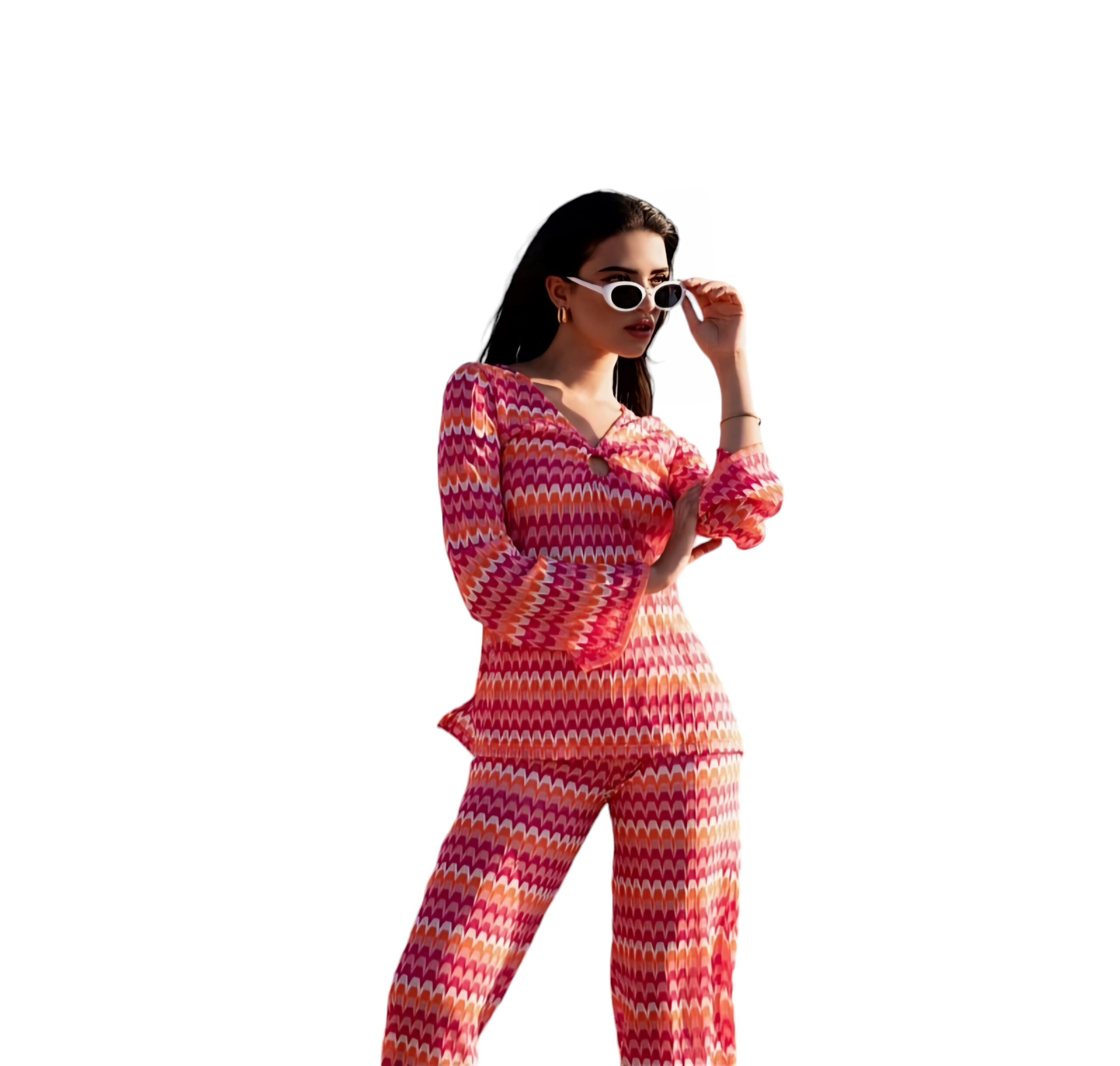 Άνετο σετ εξαιρετικής ραφής, μπλούζα με κρίκο στο μπούστο και αέρινη παντελόνα σε πορτοκαλί, φούξια και λευκό pattern